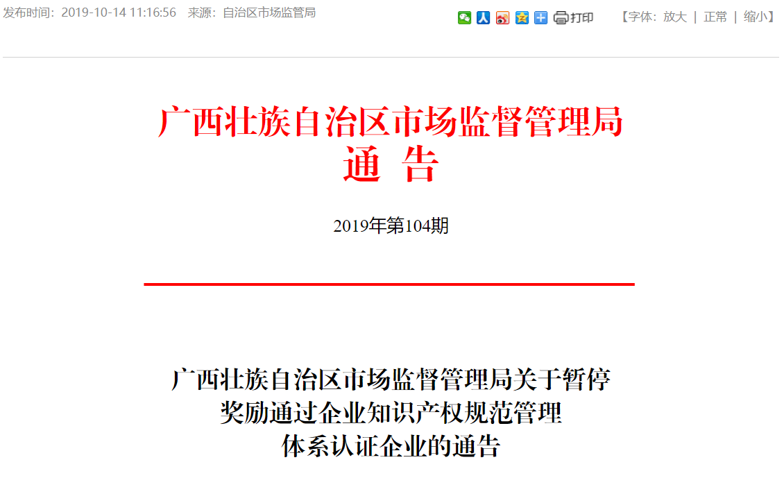 本(běn)月14號的時候廣西壯族自治區市場監督管理局發出了暫停獎勵通過企業知識產權規範管理(lǐ)體係認證企業的通告:
