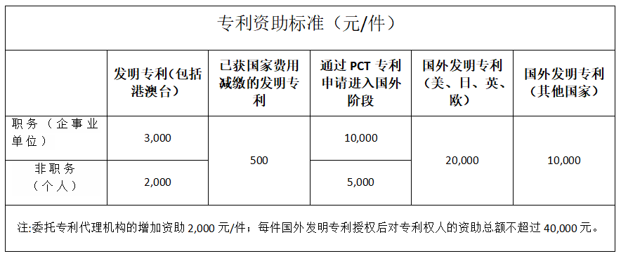 (三)PCT專利申請:通過PCT申請專利並進入國(guó)外國(guó)家階段,是職(zhí)務申請人(rén)的,資助10,000元(yuán)/件;是非職務申請(qǐng)人的,資助5,000元/件。