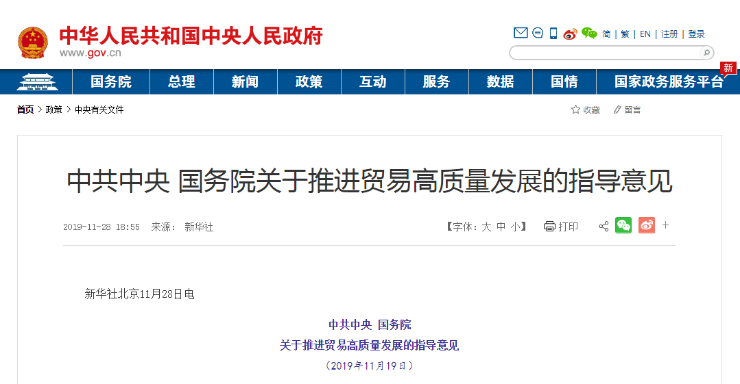 11月28日中共中央(yāng)國務院發布了(le)《中共中央(yāng) 國務院關於推進貿易高質量發展的指導意見》,關於知識產權《意見》強調: