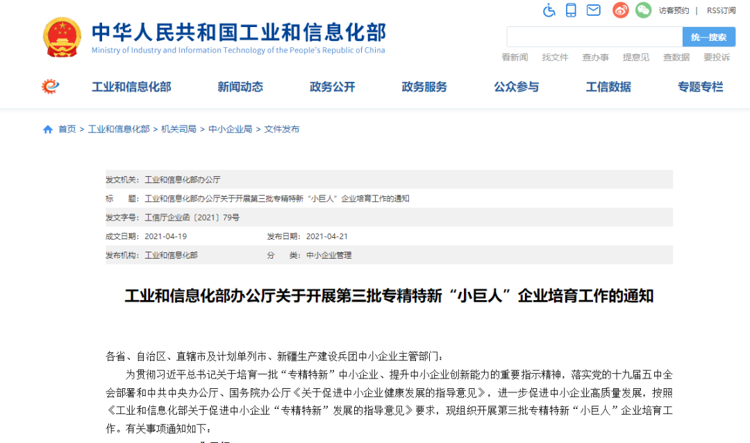 專精特新“小巨人”是工業和(hé)信息化部為貫徹習近平總書記關於培育一批“專精特新(xīn)”中小企業、提升中小企業創新能力的重要指示精神(shén),落實黨的十九屆五中全(quán)會部署和中共中央辦公廳、國(guó)務院辦公廳《關於促進中小企業(yè)健康發展的指(zhǐ)導意見》,進一(yī)步促進中小企業高質量發(fā)展,組織開展的企業培育工作。目前,全國專精特新 “小巨人”企業達4762家。
