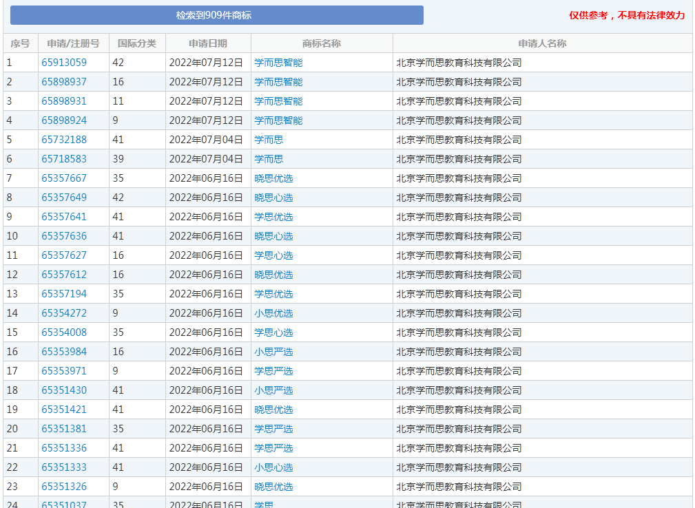 根據商標局官網顯示北京學而思(sī)教育科技有限公司近日申請注冊多個“學思嚴選”“學思心選(xuǎn)”“曉思嚴選”“學思優選”“小思心(xīn)選”商標,商標的國際分類(lèi)包括廣告銷售、教育(yù)娛樂、辦公用品等(děng)。