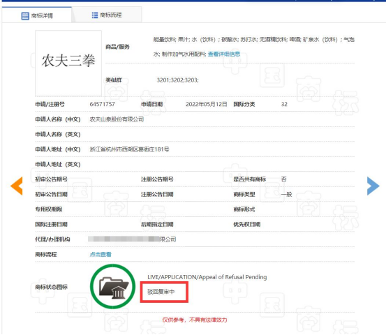 據中國商標網顯(xiǎn)示農夫山泉股份有限公(gōng)司於今年5月又申(shēn)請注冊的“農夫(fū)三拳”商標。指定使用在第32類(lèi)啤酒飲料等商品及服務上,目前(qián)商標狀態為“駁(bó)回(huí)複審中”。