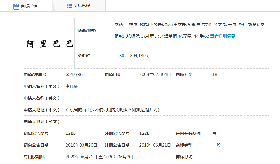 看下這件商標,“阿(ā)裏(lǐ)巴巴”,多少人夢寐以(yǐ)求的名稱,自帶超高流量的一件(jiàn)商標,2008年申請在(zài)第18類箱包上,後(hòu)受讓給李某。
