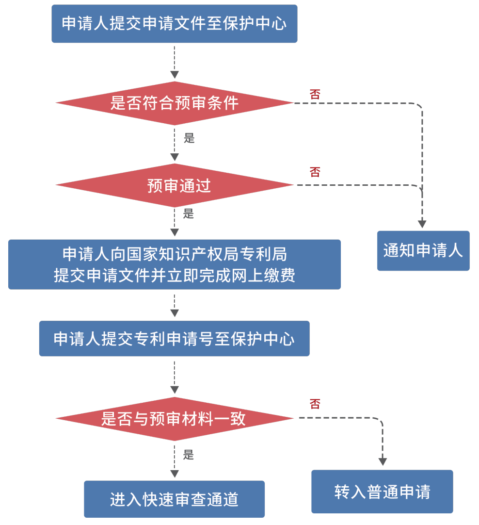 保護中心(xīn)對符合條件的申請(qǐng)人擬提交的(de)專利申請進行預先審查,形成(chéng)預先(xiān)審查結論,決定是否向(xiàng)國家知識(shí)產權局提交快速審(shěn)查申請。