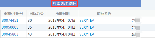 而目前僅(jǐn)有的3件 "SexyTea" 商標記錄,是一自然人於 2018 年 4 月申請的,國際分類包括廣告銷售、方便食品(pǐn)和餐飲住宿(xiǔ),均處於駁回無效的狀態。