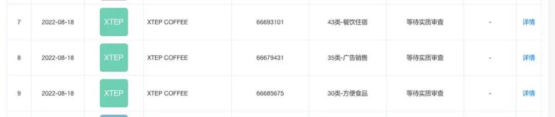 天眼查信息顯示(shì),8月18日,特(tè)步(中國)有限公司共申(shēn)請(qǐng)注冊6個咖啡相(xiàng)關商標,目前均(jun1)在“等待實(shí)質審查(chá)”中。6個商(shāng)標中包含3個“特咖啡”商標(biāo)以及3個“XTEP COFFEE”,各申(shēn)請注冊方便食品、廣告營銷、餐飲住宿3類。
