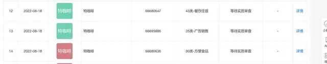天眼查信息顯示(shì),8月18日,特步共申請注冊6個咖啡相關商標,包含3個“特咖啡(fēi)”商標以及3個“XTEP COFFEE”商標,目前上述商標(biāo)均(jun1)還(hái)在“等待實質審查”階段,暫未注冊成功。