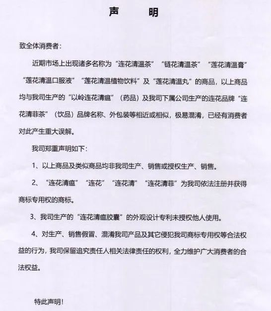 11月22日,上市公司以嶺藥業發布聲明,表示近期市場(chǎng)上出現諸多名稱為“連(lián)花清溫茶”“鏈花清溫茶(chá)”“蓮花清(qīng)溫膏“蓮花清溫口服液”“蓮花清溫植物飲料”及“蓮花清(qīng)溫丸(wán)”的商品,該公司稱,這些產品均不是以(yǐ)嶺藥業生產、銷售或(huò)授權生產、銷售的產品。