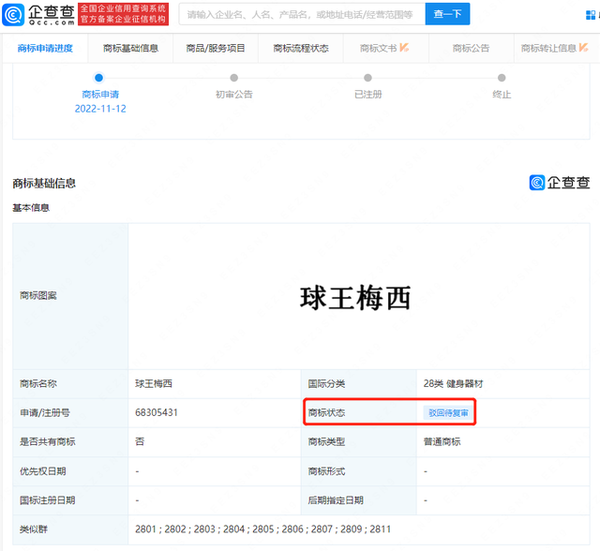 企查查APP顯示,“球王梅西”商標曾被佛山一家貿易(yì)公司申請注冊,申請時間(jiān)為2022年11月,國際分類為健身器(qì)材,不過該商(shāng)標申請已於近日被駁回。