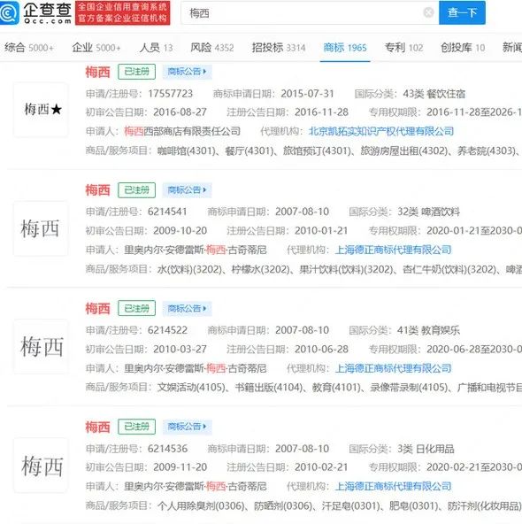 截至目前,共有40餘(yú)枚“梅西”商標申請信息,其中30枚已注冊成功,包括(kuò)梅西本人申請的多枚“梅西”商標,國際分類涉及辦公用品、教育娛樂、啤酒(jiǔ)飲料(liào)等。